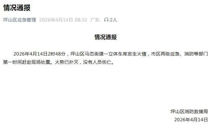 火情发生的准确时间,被坪山区消防救援局清晰记录在案。4月14日2时48分,消防部门接到报警,得知坪山区马峦街道比亚迪园区一立体车库起火后,市区两级应急、消防等部门第一时间赶赴现场处置。由于立体车库结构复杂,且停放的多为试验及报废车辆,消防队员面临不小的扑救难度,但凭借快速响应和科学处置,火势很快被控制并彻底扑灭,全程未造成任何人员伤亡。